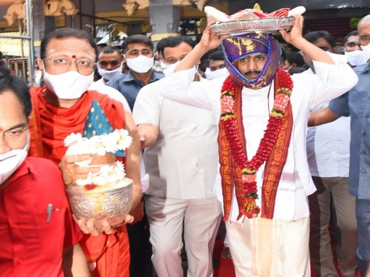 పాత రాజగోపురం వద్ద స్థానాచార్యులు విష్ణుభట్ల శివప్రసాద్ శర్మ ముఖ్యమంత్రికి పరివట్టం నిర్వహించి మంగళ వాయిద్యాలు, వేద మంత్రాలతో అంతరాలయంలోకి తోడ్కొని వెళ్ళారు. సరస్వతిదేవి అవతారంలో భక్తులకు దర్శనమిస్తున్న అమ్మవారిని సాంప్రదాయ వస్త్రధారణతో ముఖ్యమంత్రి జగన్మోహన్ రెడ్డి దర్శించుకుని పట్టువస్త్రాలు సమర్పించారు.