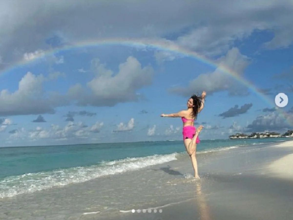 మొదటి చిత్రంలో బాహుబలి స్టార్ బీచ్లో పింక్ స్విమ్వేర్ ధరించి, బ్యాక్డ్రాప్లో పిక్చర్-పర్ఫెక్ట్ రెయిన్బోతో పోజులిచ్చింది. రెండవ క్లిక్లో, ఆమె బీచ్లో చల్లగా కనిపిస్తుంది. మరొక క్లిక్లో, నటి భోజనంలో టక్ చేయడం చూడవచ్చు.
